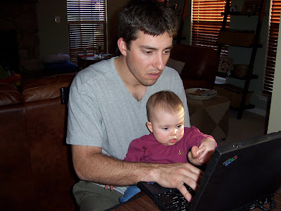 Here is Maddie with Marissa and Kaitlyn Marcoullier (Paul and Dre's girls). They are so fun to see all together. Marissa is so sweet, she always says "Hi Maddie" and Kaitlyn loves having another little baby around. I couldn't get them to all look at the camera in the first picture; they were watching a Baby Einstein video. Maddie is apparently more interested in the camera than the video!
